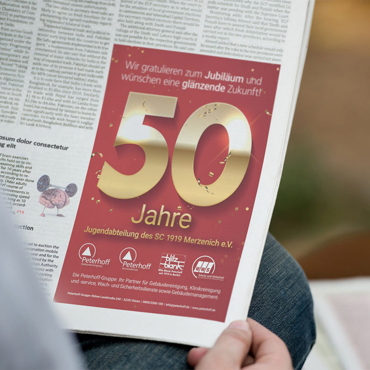 Zu den jüngsten Höhepunkten zählt die Gestaltung sämtlicher Werbematerialien und Promotion-Elemente zum 50-jährigen Jubiläum der Peterhoff-Gruppe, ein Projekt, das die Erfolgsgeschichte dieses Unternehmens eindrucksvoll unterstreicht.